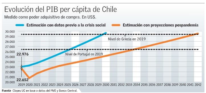 Según datos del Fondo Monetario Internacional (FMI) de octubre del 2019, Chile iba a cerrar ese año con un PIB per cápita de US$ 22 mil, medido con el poder de paridad de compra, según los parámetros del fondo. Para ese mismo año, se esperaba que Grecia y Portugal — dos de los países desarrollados con PIB per cápita más bajos de ese grupo, según el fondo— alcanzarían un monto de US$ 26 mil y US$ 29 mil, respectivamente. Así, dado ese panorama, se esperaba que Chile alcanzara el nivel de 2019 que tenían los griegos y los portugueses para el 2026 y 2030, respectivamente (ver infografía).