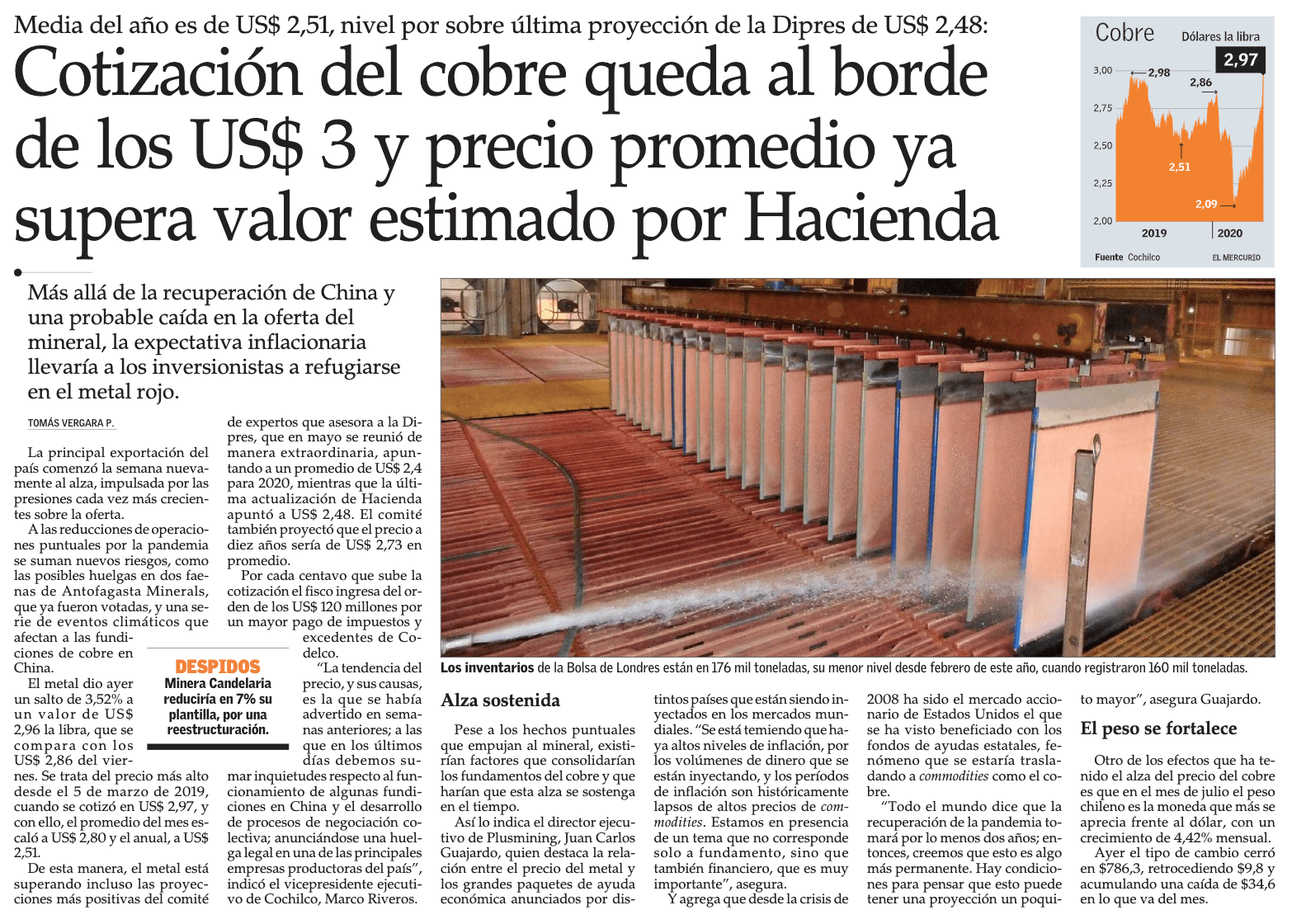 Inicio » El Mercurio » Cotización del cobre queda al borde de los US$ 3 y precio promedio ya supera valor estimado por Hacienda
