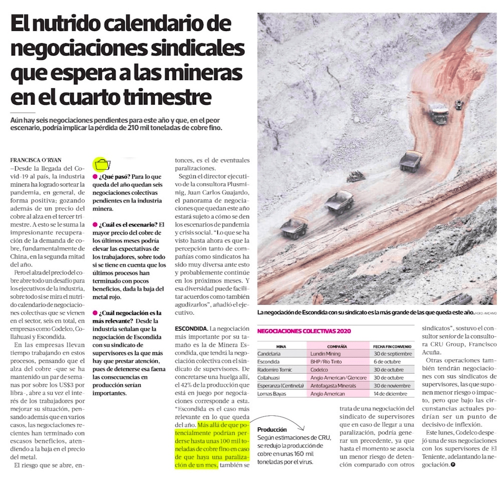 El Mercurio El nutrido calendario de negociaciones sindicales que espera a las mineras en el cuarto trimestre septiembre 16, 2020 por superadmin