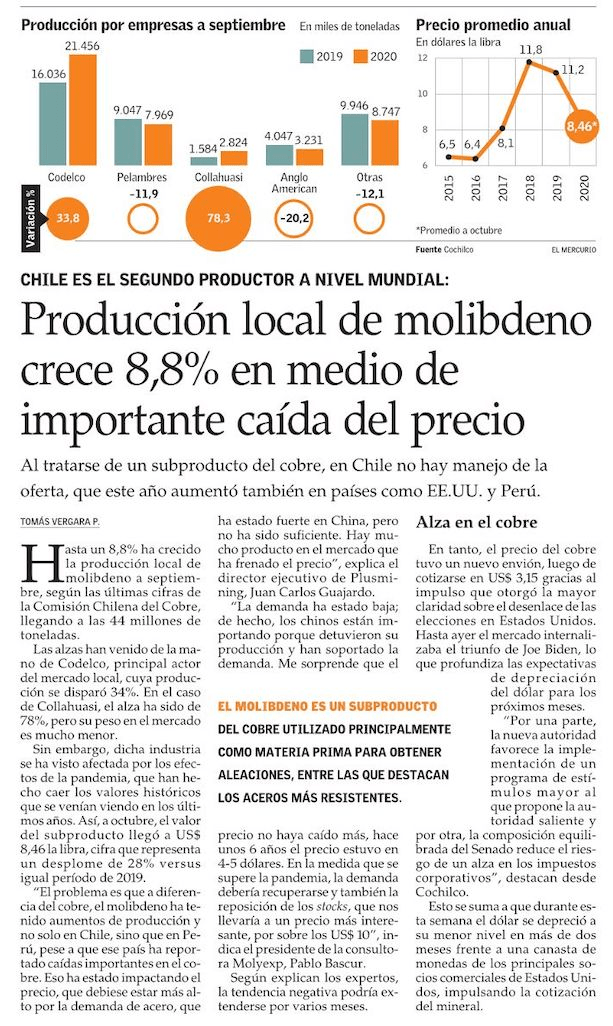 “La demanda ha estado baja; de hecho, los chinos están importando porque detuvieron su producción y han soportado la demanda. Me sorprende que el precio no haya caído más, hace unos 6 años el precio estuvo en 4-5 dólares. En la medida que se supere la pandemia, la demanda debería recuperarse y también la reposición de los stocks, que nos llevaría a un precio más interesante, por sobre los US$ 10”, interesante presidente de la consultora Molyexp, Pablo Bascur.
