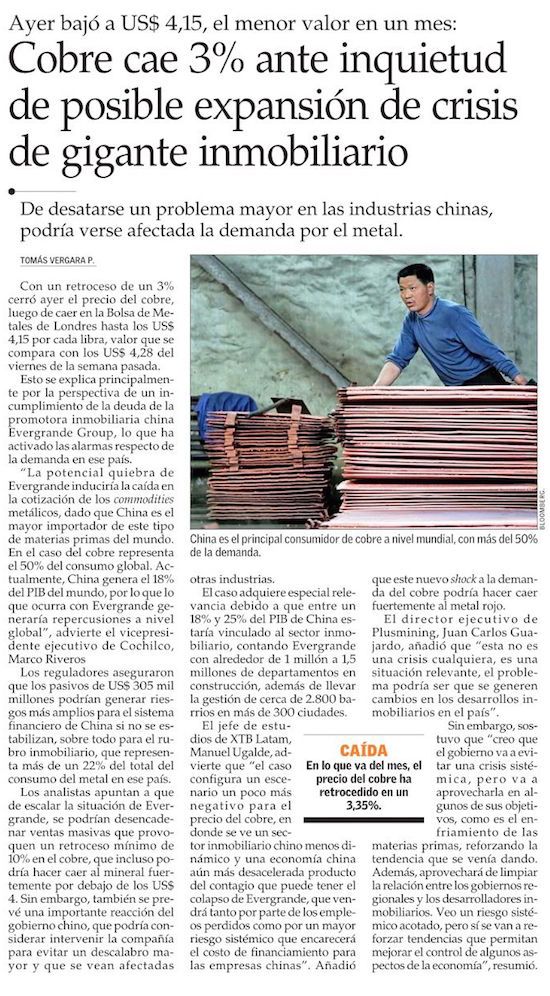 El caso adquiere especial relevancia debido a que entre un 18% y 25% del PIB de China estaría vinculado al sector inmobiliario, contando Evergrande con alrededor de 1 millón a 1,5 millones de departamentos en construcción, además de llevar la gestión de cerca de 2.800 barrios en más de 300 ciudades. El jefe de estudios de XTB Latam, Manuel Ugalde, advierte que “el caso configura un escenario un poco más negativo para el precio del cobre, en donde se ve un sector inmobiliario chino menos dinámico y una economía china aún más desacelerada producto del contagio que puede tener el colapso de Evergrande, que vendrá tanto por parte de los empleos perdidos como por un mayor riesgo sistémico que encarecerá el costo de financiamiento para las empresas chinas”.