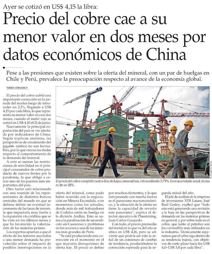 The price of copper suffered a significant correction on Tuesday after falling 2.1%, reaching US $ 4.15 per pound, which represents its lowest value in almost two months, when the red metal was quoted at $ 4.10 on June 21. Once again, the country’s main export was affected by indicators from China. According to analysts, the growth prospects of the Asian giant are not favorable, so doubts are growing regarding the behavior of demand for the mineral. Added to this are mobility restrictions in the main copper consumer as a result of new outbreaks due to the pandemic, which forced the closure of one of the most important ports in the country.