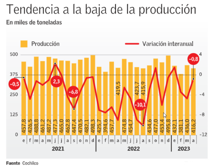 A nivel nacional, solo en abril se reportaron 416 mil toneladas de producción, lo que también estuvo por debajo del registro del mismo mes en el pasado ejercicio. Asimismo, en 24 de los últimos 28 meses se vieron contracciones en términos interanuales.